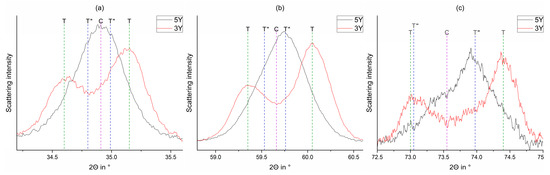 Comparison of the observed curves of the reference FDPs fabricated from 3Y_VT_1 (red) and 5Y_VT_1 (black) around 35° (a), 60° (b), and 74° (c) in 2Θ (from Figure 1) with their phase composition (T, T′´, C).