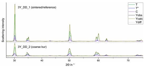 Observed (Yobs) and calculated (Ycalc) curves of FDPs 3Y_DD_1 (above; sintered FDP) and 3Y_DD_2 (below; coarse diamond bur) and the curves of the calculated phase fractions.