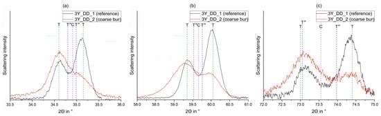 Comparison of the observed curves of the FDPs fabricated from 3Y_DD_1 (sintered, black) and 3Y_DD_2 (coarse diamond bur, red) around 35° (a), 60° (b), and 74° (c) in 2Θ (highlighted parts of Figure 3) with their phase composition (T, T´´, C).