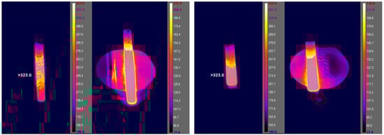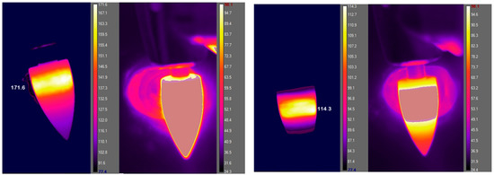 Processing with the burs and polishers was filmed using an MWIR A6700-InSb thermal imaging camera (Teledyne FLIR LLC, Wilsonville, Oregon, USA) with a thermal sensitivity of <18 mK. The dataset was analysed using ResearchIR 4.40.11 software (Teledyne FLIR LLC, Wilsonville, Oregon). The temperatures on the crowns were measured directly after removing the bur from the surface. For each measurement, two temperature ranges (77.4–216 and 146.6–323.6 °C for the burs and 20–98.1 °C and 146.6–216 °C for the polishers) were applied.