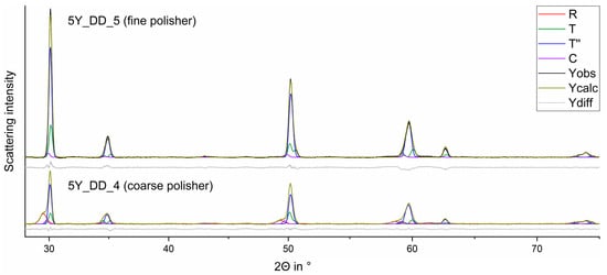 Observed (Yobs) and calculated (Ycalc) curves for FDPs fabricated from 5Y_DD_4 (above; coarse polisher) and 5Y_DD_5 (below; fine polisher) and the curves of the calculated phase fractions.
