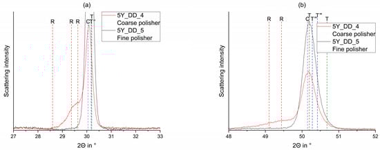 Comparison of the observed curves of the FDPs fabricated from 3Y_DD_4 (sintered, fine polisher; red) and 3Y_DD_5 (sintered, fine polisher; black) around 30° (a) and 50° (b) in 2Θ (highlighted parts of Figure 6).
