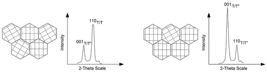 Schematic idealized illustration of grains with a preferred orientation of crystal structure and their impact on a diffractogram. The initially randomly oriented grains (left) are oriented towards 0 0 1T/T′′ (right). Since parts of the grains still have a preferred orientation towards 1 1 0T/T′′, a 1 1 0T/T′′ reflection remains. It should be noted that reflections 1 1 0T/T′′ and 0 0 1T/T′′ are located in two different spatial planes, and therefore, cannot be represented in a 2D drawing.