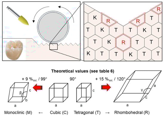 Under mechanical loading (alumina particle blasting and grinding in the lab), the formation of a rhombohedral/trigonal phase (R; R) was observed [31,32,33,34]. This phase is a hettotype of the cubic phase (spacegroup Fmm → spacegroup R). It retains only the trigonal symmetry element and features–compared to the cubic phase–a highly distorted elementary cell [33,35,36].