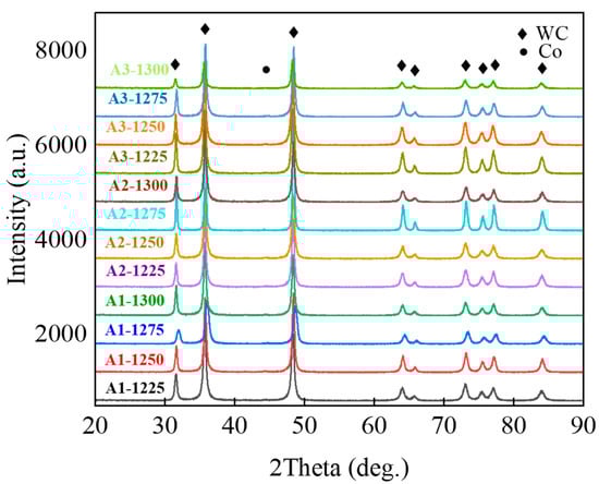 XRD patterns of sintered phases of WC-Co cemented carbides.