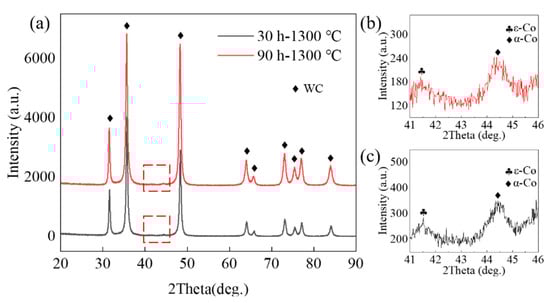 The XRD results of each samples showed little change at the macroscopic level, but there were some variations at the microscopic level. As shown in Figure 2a,b, it was found that in the range from 41° to 46°, there were two different Co phases, namely the α-Co and ε-Co phases. These two phases demonstrated significant influence on the mechanical properties of the cemented carbide. Among them, the existence of α-Co was conducive to the improvement of strength, and the transformation of α-Co into ε-Co negatively impacted strength []. For α-Co and ε-Co, the quantitative analysis results of the XRD adiabatic method at ball-milling times of 30 h and 90 h were as follows: the contents of α-Co were 54.8% and 45.2%, respectively, and the contents of ε-Co were 48.1% and 51.9%, respectively. It was found that the content of ε-Co increased with the increase in ball-milling time, demonstrating a serious effect on the subsequent TRS.