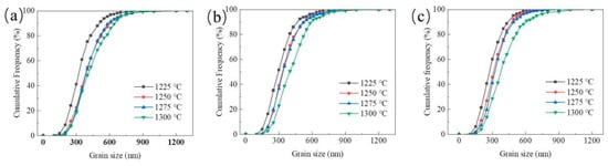 Cumulative distribution curve of the grain size of WC-Co cemented carbides under different ball-milling times: (a) A1, (b) A2, and (c) A3.