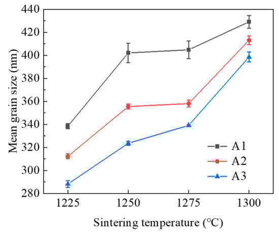 Figure 4 and Figure 5 show the cumulative grain size distribution and mean grain size of sintered WC-Co cement carbides at different sintering temperatures and ball-milling times. As shown in Figure 4, it was found that with the decrease in sintering temperature, the grain size distribution became wider. This indicated that most of the grains were mainly concentrated in the small size range. As shown in Figure 4a, the cumulative grain size distribution of the cemented carbide samples tended to the left, and the grain size of about 41.2% of WC particles was less than 300 nm at 1225 °C. The grain size of the particles was less than 300 nm in about 21% of WC particles at 1250 °C and 1275 °C and about 18.7% of WC particles at 1300 °C. The same situation is also shown in Figure 4b,c. At the sintering temperatures of 1250 °C and 1275 °C, the cumulative grain size distribution curves of all ball-milling times were basically consistent and the average grain sizes were similar, indicating that the grain growth was not obvious in this temperature range. As shown in Figure 5, the average WC grain sizes at SPS sintering temperatures of 1300 °C, 1275 °C, 1250 °C, and 1225 °C were 429.12 nm, 404.77 nm, 402.12 nm and 338.47 nm, respectively, at 30 h of ball-milling time. The change of grain size between 1250 °C and 1275 °C was not obvious and similar to a bottleneck. Moreover, the grain size increased by 22% from 1225 °C to 1300 °C at 30 h of ball-milling time. Similarly, the grain size increased by 26% and 28% at ball-milling times of 60 h and 90 h, respectively. With the increase in ball-milling time, the crushing degree of WC particles intensified and finer cemented carbide particles were obtained. These fine WC particles had high surface activity, accelerating the dissolution and precipitation process of WC particles at higher temperatures and further improving the growth degree of particles in the sintering process. The results showed that the finer grain led to a greater the degree of grain growth at high temperatures.