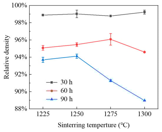 Figure 6 shows the relative density of WC-Co cement-carbide-sintered samples at different sintering temperatures and ball-milling times. It was found that the relative density of all samples was more than 98% after ball milling for 30 h, and the change of relative density was not obvious with changes of temperature. The same was true for a ball-milling time of 60 h, after which the relative density was around 95.5%. When the sintering temperature reached 1275 °C, the relative density of sintered sample reached 96.9%. This was mainly related to the dissolution of hard phase WC grains in Co. With the increase in temperature, the solubility of WC (there are solubility limits for W and C in liquid Co) increased and the WC grains dissolved in Co increased, which promoted the dissolution–precipitation process. In addition, the increase in temperature also provided heat energy, increasing the activity of Co and improving its driving force. Therefore, increasing its capillary force with WC grains enhanced the fluidity of the liquid phase to effectively fill the pores in the WC framework and slightly increased the density of the sample. However, when the eutectic temperature of the WC-Co composite powder was higher than 1300 °C, less of the liquid phase was produced. Therefore, it was still in the range of solid-state sintering, and the change of temperature had little effect on the relative density.
