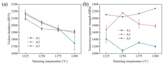 Figure 7 shows the mechanical properties of WC-Co cement-carbide-sintered samples at the different sintering temperatures and ball-milling times. Figure 7a demonstrates that the Vickers hardness of the sintered samples generally reached the maximum after ball milling for 90 h. At the same sintering temperature of 1225 °C, the corresponding hardness values of the samples with ball-milling times of 90 h, 60 h, and 30 h were 2173.8 kg/mm2, 2154.5 kg/mm2, and 2095.1 kg/mm2, respectively. According to the Hall–Petch relationship, the size of WC grains has a great influence on hardness []. With the increase in temperature, the WC grains of each ball-milling time showed obvious coarsening phenomena. Then, their hardness decreased by 10%, 9.7%, and 7.7%, respectively, at 1225 °C, 1250 °C, and 1275 °C. When the sintering temperature reached 1300 °C, the hardness of the samples sintered for 90 h sharply decreased by about 11%. For 30 h and 60 h, the hardness was relatively stable at 1917 kg/mm2 and 1894.2 kg/mm2, respectively. The rapid decrease in hardness mainly occurred because the relative density of the sintered samples at 90 h was lower than that of other samples. In general, two important factors change the hardness of the sintered compacts: relative density and grain size. The former affects hardness due to the existence of pores, and the latter worsens the hardness due to grain coarsening [,,]. When the sintering temperature was lower than 1300 °C, the decrease in its hardness was mainly caused by the coarsening of its grains, and the effect of relative density was not obvious. However, when the sintering temperature was as high as 1300 °C, the relative density sharply dropped, as shown in Figure 6. The main reason for this drop was that the combination of the agglomerates formed by the fine WC grains and the matrix was unstable, thus becoming the source of cracks and causing pores that had an important influence on the hardness. These results reveal that the relative density was the most important factor affecting hardness, as a rapid decrease in the relative density led to a rapid decrease in hardness.