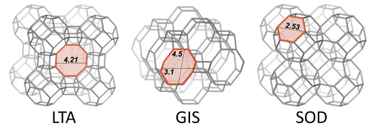 LTA-framework viewed along (100), GIS-framework viewed along (010) and SOD-framework viewed along (010). The respective largest window is highlighted in red and the numbers represent the dimensions in Å (modified after [40]).
