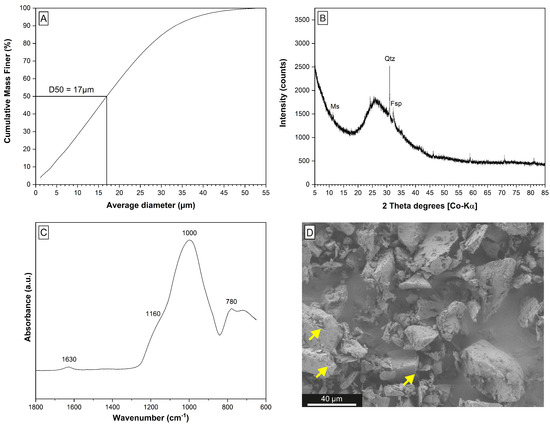 Industrial-grade perlite powder is a non-expandable, fine-grained by-product of limited use that accumulates during the processing of raw perlite ore. The perlite powder studied here was used as received without any pre-treatment. The material is light grey in color, has a grain size of <55 µm with a median diameter (d50) of 17 µm (Figure 2A), and a specific surface area (SSA) of 2.9 m2/g. The molar Si:Al ratio (SAR) is 4.33; the chemical composition is indicative of a rhyolitic chemistry (Table 2). The mineralogical composition is dominated by an amorphous phase (∼96.0 wt.%) and minor quartz (2.0 wt.%), feldspar (1.5 wt.%), and muscovite (0.5 wt.%) (Figure 2B). The infrared spectroscopic analysis (Figure 2C) reveals a broad adsorption at ∼1000 cm−1 and a smooth one at ∼1160 cm−1, which belong to the asymmetric stretching vibrations of Si-O-Si and Si-O-Al planes [41]. Adsorption in the region from 1250 to 850 cm−1 is characteristic for an amorphous alumosilicate network and the weak adsorption at 1630 cm−1 is related to the deformation mode of molecular water in raw perlite [41]. The electron microscopic inspection of the perlite shows the amorphous phase to be composed of volcanic glass shards (Figure 2D).