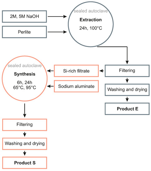 Consequently, 3 g of perlite raw material were reacted with 30 mL of 2 M or 5 M NaOH solutions at 100 °C for 24 h to obtain zeolites with a GIS or SOD framework structure (product E in Figure 3). All experiments were carried out in stainless steel autoclaves with a Teflon liner sealed with a Teflon cap. The autoclaves were placed in an oven equipped with a rotating overhead system to ensure complete homogenization of the suspensions.