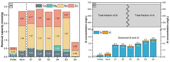 Waste solutions typically contain distinct pollutants, such as heavy metal ions, and harmless dissolved components of different concentration and type, such as Ca2+, Mg2+, Na+, K+, etc., which all have different affinities to sorb onto charged mineral surfaces [60]. In this work, the total removal capacities for Ca2+, Mg2+, Ba2+ and Zn2+ ions from an equimolar multi-component waste solution (expressed as CEC in mmol/g) by the synthetic GIS-, SOD- and LTA-zeolites, as well as by the perlite powder and commercial zeolite A, were determined using sorption experiments performed at a liquid:solid ratio of 500:1, at pH ∼6.0 and 25 °C (Figure 7A). It is evident that the perlite has the lowest sorption capacity (0.56 mmol/g) among all materials tested, followed by synthetic SOD-zeolite displaying a moderate CEC (E4: 0.88 mmol/g), and synthetic GIS-zeolite (E2: 2.69 mmol/g), commercial zeolite A (2.73 mmol/g) and synthetic LTA-zeolite (S1–S4: 2.69–2.86 mmol/g), which have the highest CEC values. The highest CEC values are equivalent to a net ion removal capacity of 240 up to 275 mg/g of Me2+ for the LTA-zeolites, which illustrates their high efficiency for wastewater treatment [57]. In general, the removal of Me ions occurred in the order Ba2+ > Zn2+ > Ca2+ > Mg2+, except for SOD-zeolite and LTA-zeolite S4, where the ion exchange occurred the order Zn2+ > Ba2+ > Mg2+ > Ca2+ and Ba2+ > Zn2+ > Mg2+ > Ca2+, respectively, (Figure 7A). This selective sorption behavior is explained by the individual structure of the zeolites, the properties of the metal cation such as hydration diameter and hydration energy and the distinct interactions between a certain zeolite and Me ions at the solid–liquid interface [5,56,59]. The porous zeolitic network plays a decisive role in the attraction and repulsion of Me ions, as indicated, e.g., by molecular simulations of selective cation exchange reactions in different zeolite framework structures [61]. Comparing the hydrated radii of the metal cations (Table 5) with the pore openings of the zeolites (Figure 1), it appears that some water must have been separated from the cations during the ion exchange process [5].