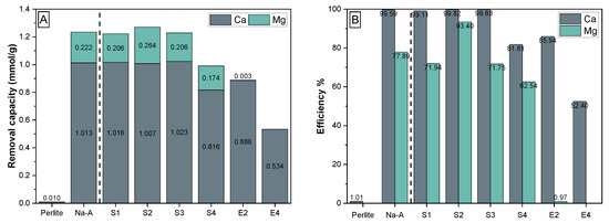(A) Removal capacity for Ca2+ and Mg2+ ions by synthetic GIS- (E1), SOD- (E2) and LTA-zeolites (S1–S4) from Graz tap water. Perlite powder and commercial zeolite A (Na-A) are included as a reference. (B) Removal efficiencies for Ca2+ and Mg2+ ions measured at ion exchange equilibrium with Graz tap water, demonstrating the applicability of the zeolites for water softening purposes.
