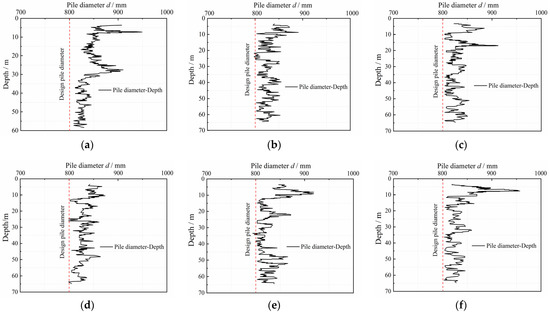 Curves of bore diameter and depth. Pile aperture curve of: (a) No. 3 pile; (b) No. 37 pile; (c) No. 65 pile; (d) No. 91 pile; (e) No. 207 pile; (f) No. 209 pile.