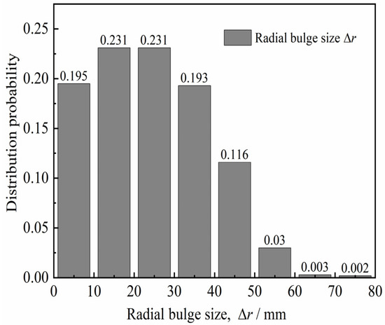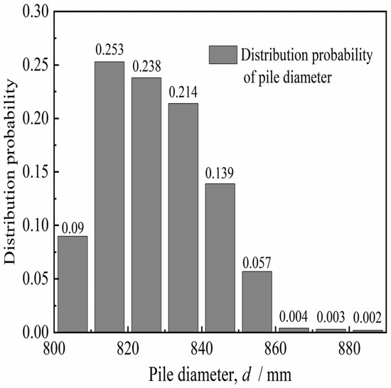 We aimed to quantitatively analyze the diameter of the in situ bored pile and the variation of the concave and convex surfaces of the pile side according to the diameter detection curve of six in situ bored piles (design aperture of 800 mm) in the Pudong area of Shanghai, China [25,26]. Hence, the aperture curves were plotted as shown in Figure 1. The distribution probability of pile diameter d and radial bulge size Δr of each pile diameter curve were obtained statistically, as shown in Figure 2 and Figure 3 (Δr = d/2 − rmin, rmin is the minimum pile diameter after hole formation). Figure 2 and Figure 3 show that the pile diameters of the in situ bored piles were mostly in the range of 800–850 mm, and the frequency was 93.4%. The distribution frequency of the radial bulge dimension Δr was as follows: the distribution frequency of 0–10, 10–20, 20–30, 30–40, 40–50, and 50–80 mm was 19.5%, 23.1%, 23.1%, 19.3%, 11.6%, and 3.5%, respectively. This phenomenon shows that the distribution frequency of the radial bulge size Δr was mainly in the range of 0–50 mm, and the frequency was 96.6%; the maximum value of the radial protrusion dimension Δrmax was approximately 80 mm. The average value of the radial protrusion dimension was 27.6 mm.