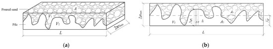 According to the geometric relationship illustrated in Figure 4, the sand-pouring surface area is and the sand-pouring cross-sectional area is , where V1 is the volume cross-sectional area of the in situ bored pile, and rmax and rmin are the maximum and minimum radii of the in situ bored pile cross-sectional area, respectively. The average sizes of radial protrusions , li and Δri are the unit length and size of the radial protruding part under the unit length, respectively. The cube height can be defined by Δrmax = rmax − rmin. As specified by the sand-pouring method, the pile side roughness can be expressed as: