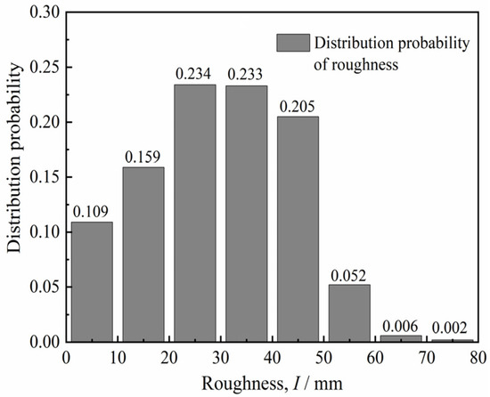 The surface roughness I of the pile side is calculated by Equation (2). The distribution probability of the roughness I is obtained statistically, as illustrated in Figure 5. The distribution probability of roughness I in the ranges of 0–50 mm and 50–80 mm was 94.0% and 6.0%, respectively. Therefore, the roughness I with a higher distribution probability was taken as 10, 20, and 30 mm and as the roughness value of the test concrete block.