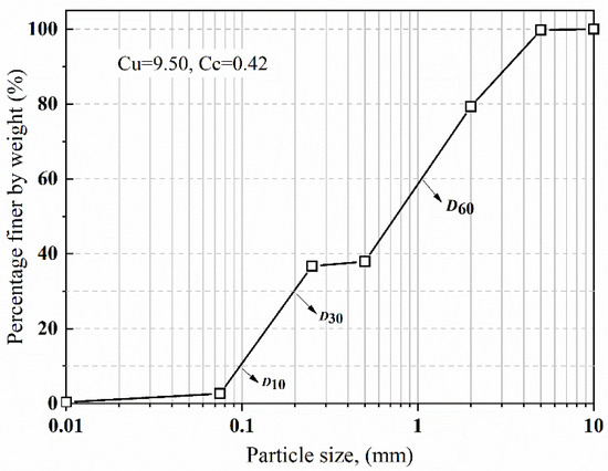 The soil used in the test was mainly derived from sand from the Xiangjiang River, located in the Hunan province of China, due to its relatively uniform grain size distribution and good control for soil relative density during compaction. Figure 8 illustrates the grain size distribution curve of the soil particle size. The sand was regarded as coarse according to the particle analysis and ASTM D2487 (ASTM 2020) [27]. The average grain size D50, maximum void ratio emax, minimum void ratio emin, and specific gravity Gs of the sand were 0.75, 0.73, 0.43, and 2.55, respectively. Table 1 presents the basic physical parameters and mechanical properties of the sand.