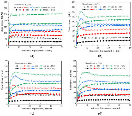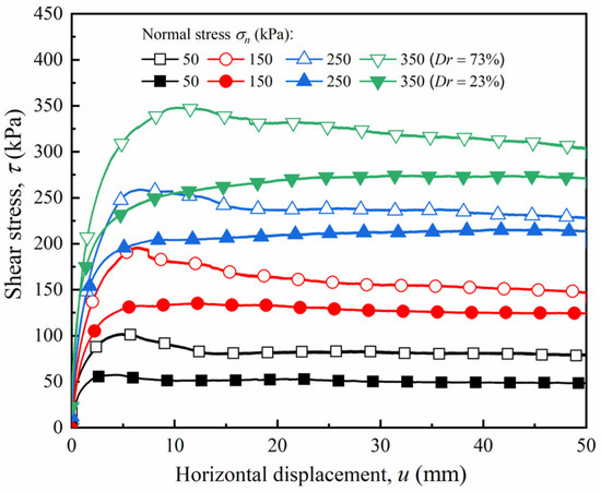 Shear stress–horizontal displacement (τ − u) curves for pure sand with different relative densities under various normal stresses.