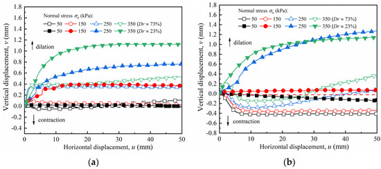 Figure 13 shows the relationship curve of the vertical–horizontal displacement of the sand–concrete interface with dense and loose sand under various normal stresses. As shown in Figure 13, the volume expansion is the dilation behavior with negative values, while the volume contraction is the contraction behavior with positive values. The maximum volume change values, including those of dilation and contraction of the sand–concrete interface, are summarized in Table 4.