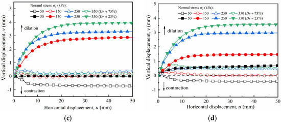 Vertical–horizontal displacement (v − u) curves of sand–concrete interface with different relative densities and normal stresses: (a) I = 0 mm; (b) I = 10 mm; (c) I = 20 mm; and (d) I = 30 mm.
