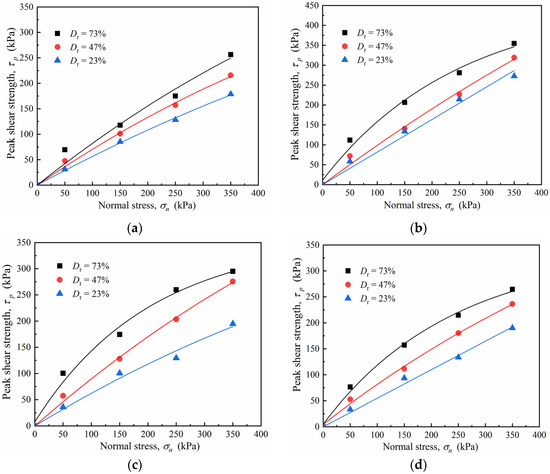 Peak shear strength–normal stress (τp − σn) curves of sand–concrete interface with different densities and normal stresses: (a) I = 0 mm; (b) I = 10 mm; (c) I = 20 mm; and (d) I = 30 mm.