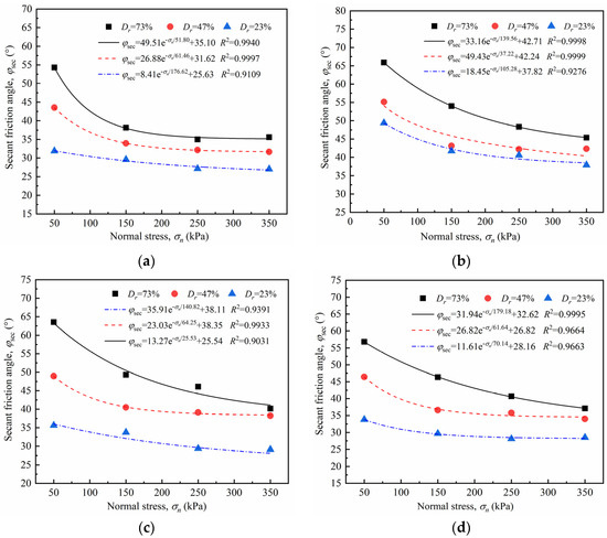 Secant friction angle–relative density (φsec − Dr) curves of sand–concrete interface under different surface roughness: (a) σn = 50 kPa; (b) σn = 150 kPa; (c) σn = 250 kPa; and (d) σn = 350 kPa.