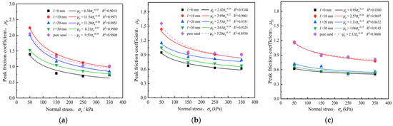 Figure 16 shows that the peak friction coefficient reduced approximately as a power function when normal stress increased under different densities. High normal stress conditions led to a slight reduction of the peak friction coefficient. For the interface with roughness I = 20 mm and soil density Dr = 73%, the peak friction coefficient decayed from 2.01 to 1.14 and the attenuation rate was 42.28% as the normal stress increased from 50 to 150 kPa. However, when the normal stress increased from 150 to 350 kPa, the attenuation rate of the peak friction coefficient was 8.23%. The peak friction coefficient reduced as normal stress increased; however, this phenomenon does not account for the reduction in the interface shear strength. As mentioned in Section 4.1, higher normal stress is related to higher shear stress at the same interface roughness. This indicates that, as normal stress increased, the peak shear strength changed slightly, causing a decrease in the ratio of τp/σn; i.e., the peak friction coefficient gradually attained stability under high normal stress. An increase in normal stress caused a simultaneous increase in the interface peak shear strength, preventing the reduction of the peak friction coefficient. This result is consistent with that of Wang et al. [42] and Zhang et al. [43], who investigated the effect of normal stress and relative density on the interface friction of a stone column–geosynthetic interface, respectively. They found that a reduction in increment of peak shear stress results in a decrease in the peak friction coefficient, rather than the peak shear strength.