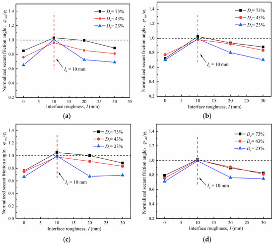 Figure 17 illustrates the relationship between the secant friction angle and roughness for the sand–concrete interface under different normal stresses. It can be noted that the normalized secant friction angle increased as roughness increased from 0 to 10 mm under different densities, and then decreased as roughness increased from 10 to 30 mm. The variation of the normalized secant friction angle with different roughness values indicates the existence of critical roughness Icr; i.e., when I < Icr, φsec/φs increased as roughness also increased; when I ≥ Icr, φsec/φs decreased as roughness increased. As the normalized secant friction angle peaked at the critical roughness, the shear strength of the soil particles was fully mobilized and peaked. Moreover, the soil above the interface experienced ultimate deformation. These findings correspond with those of Qian et al. [45,46], who suggested the optimal thread spacing for studying the pull-out bearing capacity mechanism of grouting threaded piles. At the optimal thread spacing (identical to the critical roughness), the soil shaping area around the pile sank and the pull-out bearing capacity peaked. At the same relative density, the normalized secant friction angle φsec/φs satisfied the following order: > > > . This conclusion is consistent with that of the peak friction coefficient as mentioned before.