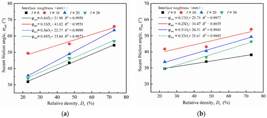 where A and B are the fitting parameters representing the increase rate of the secant friction angle φsec as relative density increases as well as the influence of other factors, except relative density, on the secant friction angle φsec. Figure 18 illustrates that the increasing rate of the φsec gradually reduced with the increase in normal stress σn. For the interface with I = 10 mm, the increase rate of the φsec was 33.43%, 29.38%, 19.70%, and 19.06%, corresponding to the normal stress of 50~350 kPa. Despite the changes in relative density, the φsec of the smooth interface was always below that of the rough interface, whereas that of the critical roughness Icr = 10 mm was above those of all the tests. This indicates that, unlike the smooth interface, the rough interface is required to mobilize more soil particles to facilitate shear resistance. Moreover, the effect of roughness on shear resistance does not always increase with increasing roughness.