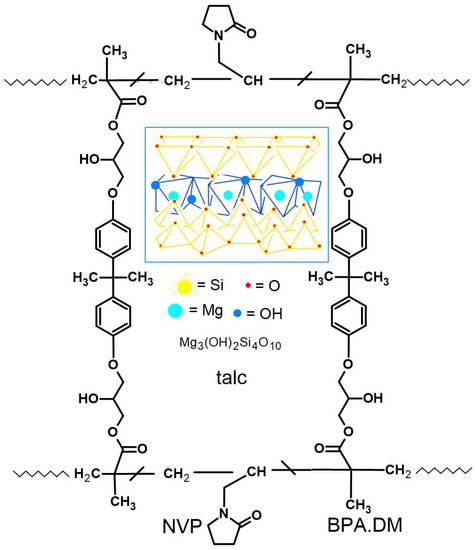 Bisphenol A glycerolate (1 glycerol/phenol) di-methacrylate (BPA.DM), N-vinyl-2-pyrrolidone (NVP) and 2,2-dimethoxy-2-phenylacetophenone (Irgacure 651, IQ) were purchased from Merck, Darmstadt, Germany. The talc particles were obtained from Elementis Minerals (East Windsor, NJ, USA). The following talc products were used: (i) Mondana 8 HT, (ii) Mondana 15 HT, (iii) Mondana 35 HT, (iv) Mondana 50 HT, (v) Mondana Scrub 250, (vi) Mondana Scrub 500 and (vii) Mondana Scrub 710. The values given next to the name mean that 98% of the talc particles are of an equal or smaller size (d98%) in µm. All chemicals were used as received.