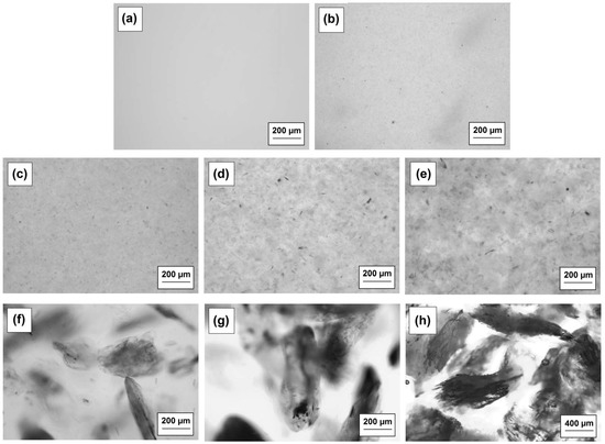 Figure 3 presents the photos of the fragmentary composite structure with different sizes of talc. Samples 2–5 (see Figure 3b–e) are characterized by a homogeneous structure. In contrast, the materials with the largest size of talc (≤250–710 µm) are characterized by clearly visible filler particles. In addition, in the case of samples 6–8 (see Figure 3f–h), the talc fragments are very large, and irregular distribution of the filler in the compositions is observed.