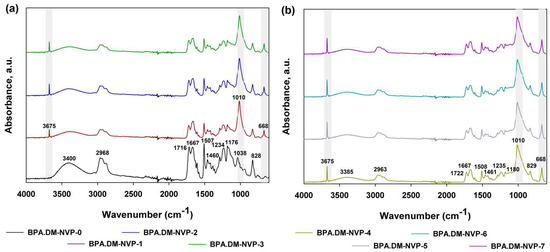 ATR/FTIR spectra of the prepared composites: BPA.DM-NVP-0–BPA.DM-NVP-3 (a) and BPA.DM-NVP-4–BPA.DM-NVP-7 (b).