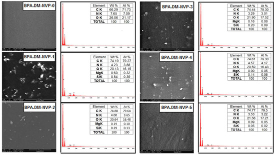 SEM images of the sample surfaces and the corresponding results of the EDX microanalysis are presented in Figure 5.