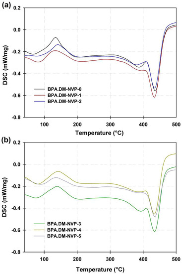 DSC curves of the polymer composites: BPA.DM-NVP-0–BPA.DM-NVP-2 (a) and BPA.DM-NVP-3–BPA.DM-NVP-5 (b).