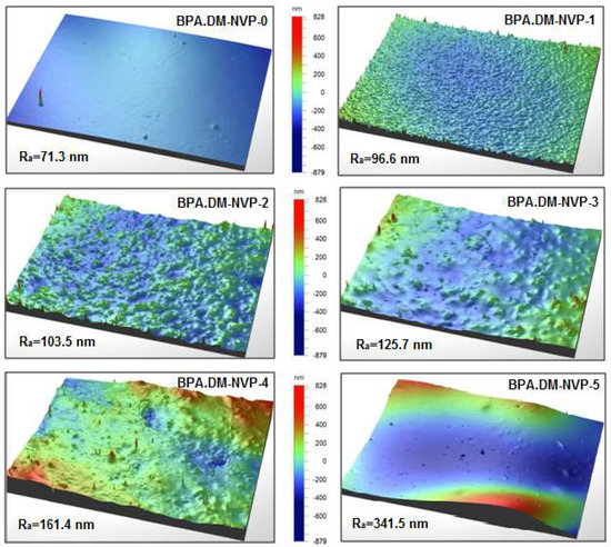 An optical profilometer (Contour GT-K1, Veeco, Aschheim/Dornach Munich, Germany) was used to investigate the morphological images and surface roughness of the samples. This device is characterized by high accuracy in the size range from the sub-nanometer to 10 mm; nevertheless, the imaging was repeated 3 times for each sample in order to determine the average roughness (Ra) parameter.