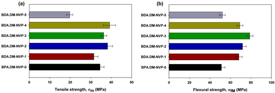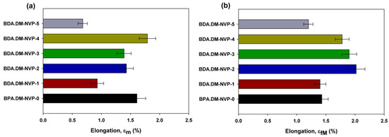 Analyzing the results of the deformation test, it is clear that in the complex state of stress that occurs during bending, the highest values (see Figure 10b) were obtained for the specimens BPA.DM-NVP-2 and BPA.DM-NVP-3. However, in the case of uniaxial stretching where the force acts only in one plane, the smallest elongation was observed for the smallest and the largest values of talc grains (see Figure 9a).