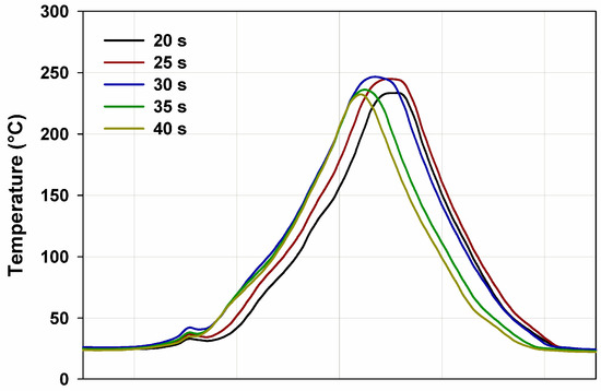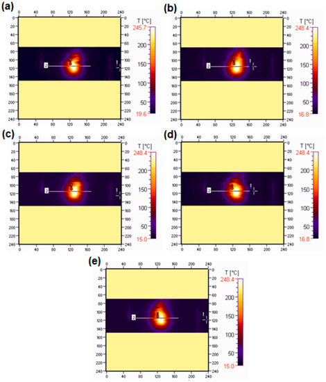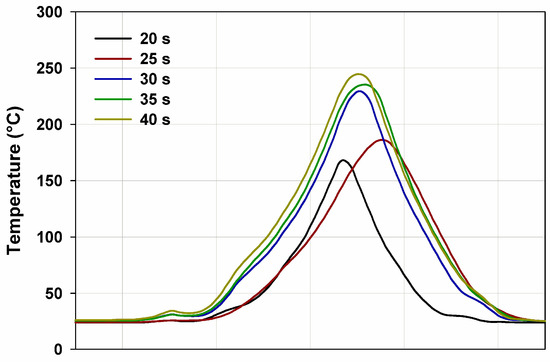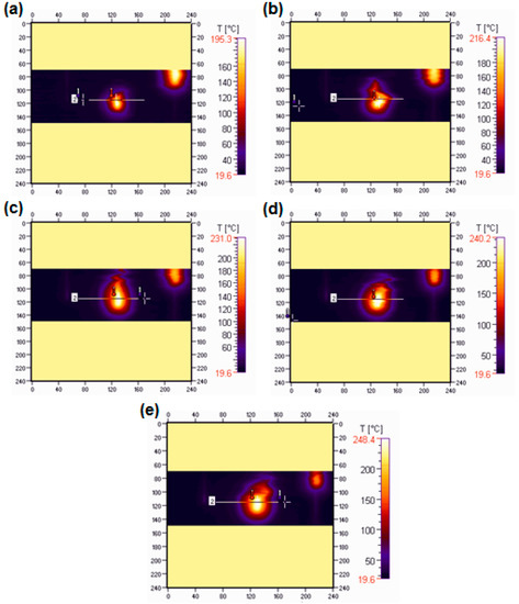 Subsequent testing of flammability was based on the horizontal burning test carried out in a device that included a combustion chamber, ventilation system and thermal imaging camera. The procedure is in accordance with the PN-EN 60695-11-10—method A. The samples were placed on a tripod and moved near a methane burner at an angle of 45°. After 10 s, the samples were left to burn freely for 30 s. The measurement included collection of thermal images of the samples (after every 5 s), measurement the total burning time and examining of the length of the sample after burning. The images of samples were collected using a V-20 thermo-vision camera model ER005-25 (Vigo System, Ożarów Mazowiecki, Poland), which operates in the temperature measurement range from −10 to 250 °C with a measurement accuracy of ±2 °C.