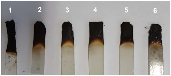 Samples after the burning test: sample 1—BPA.DM-NVP-0, sample 2—BPA.DM-NVP-1, sample 3—BPA.DM-NVP-2, sample 4—BPA.DM-NVP-3, sample 5—BPA.DM-NVP-4 and sample 6—BPA.DM-NVP-5.
