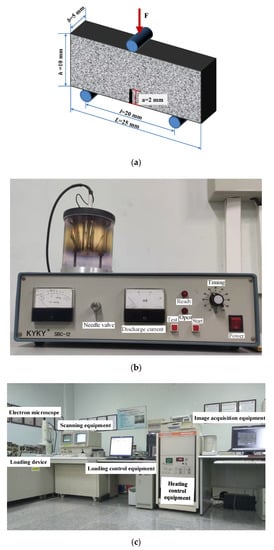 The coal blocks used in the experiments were collected along with the bedding plane from the 14-3# coal seam (high gas mine) of Xinzhouyao (XZY) Coal Mine in Datong City, Shanxi Province, China, with a sampling depth of 313~357 m. The gas emission rate of this coal layer is 32.55 m3/t [39]. The collected coal blocks were processed into a cuboid with a length of 25 mm, a width of 10 mm and a thickness of 5 mm, due to the limitation of the loading system and SEM devices. The long side of the coal sample is parallel to the bedding plane. To capture the crack evolution, a U-shaped notch with a length of 2 mm and a width of 0.4 mm was prefabricated on the sample, as shown in Figure 1a. The span distance between two support points was set as 20 mm. The above sample-making scheme was carried out in strict accordance with the method recommended by International Society for Rock Mechanics (ISRM) [40]. The small pieces, remained after making the cuboid samples, were collected for MIP and gas adsorption experiments.