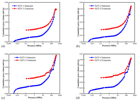 Mercury intrusion and extrusion curves of coal samples. (a) XZY-1; (b) XZY-2; (c) XZY-3; (d) XZY-4.