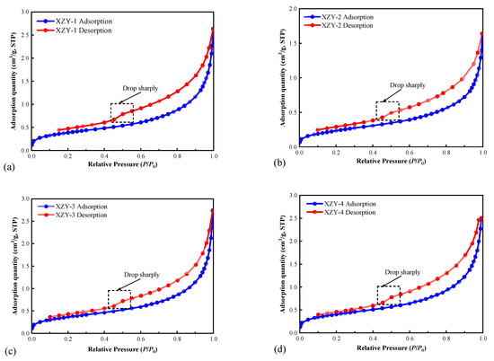 Low-temperature liquid N2 adsorption and desorption curves: (a) XZY-1; (b) XZY-2; (c) XZY-3; (d) XZY-4.