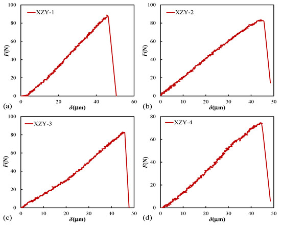 The curves of load-displacement for coal samples are displayed in Figure 4. Ignoring the clamping force of the fixture, the maximum extreme loading value is XZY-1 sample (88.9 N) and the minimum is XZY-4 sample (74.6 N). The average extreme loading value is 82.5 N. The fractured displacement of each coal sample is nearly equal, with an average value of 48.9 μm. On the load-displacement curves, it can be found that four specimens show obvious brittle failure characteristics during the period of rapid decline of bearing capacity after peak loading.