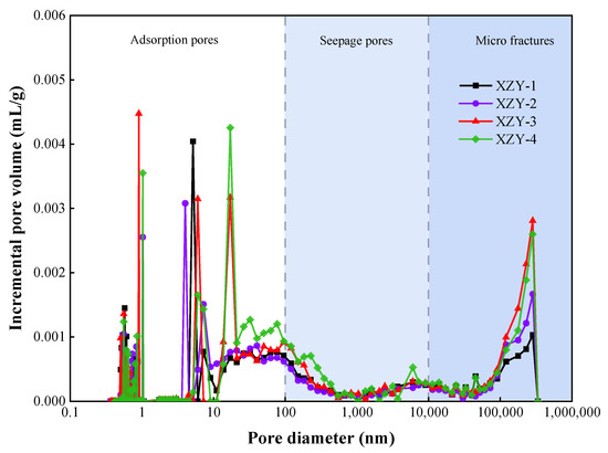 The PSDs of samples are shown in Figure 5. The PSDs of coal samples present multi-peak shapes. Thereinto, for adsorption pores (<100 nm), the PSDs exhibit a multimodal distribution with a main peak in the pore interval of 1~20 nm, which is convenient for the enrichment of gas. For pores size from 100 nm to 10,000 nm, there is a bimodal distribution, and the pore content is nearby zero in the valley points (500~2000 nm). The PSDs of micro fractures reveal a unimodal distribution with a peak in the pore size of 10~30 μm.