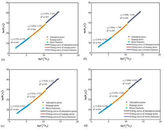 Surface fractal dimensions of coal samples. (a) XZY-1; (b) XZY-2; (c) XZY-3; (d) XZY-4.