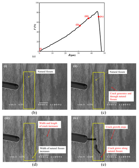The surfaces of coal samples were scanned synchronously by SEM to observe micro crack generation and development in the process of loading. Pictures of the cracks at the prefabricated notch of the XZY-3 coal sample are shown in Figure 7b–e at the instances (I–IV) marked on the load–displacement curve in Figure 7a. At the beginning of loading, there is no crack at the precast notch, but there is a natural fissure near the notch (see Figure 7b). When the load increases to 53.6 N, the micro crack is spotted at the tip of the fabricated notch and through the natural fissure (see Figure 7c). When the load reaches 68 N, the width of the micro crack and the opening of the natural fissure increases, and the displacement of the corresponding load head is 37.8 μm (see Figure 7d). Due to the SEM scan interval, all scanning images of crack propagation during the fracture process cannot be taken, e.g., crack morphology corresponding to peak load. After the peak load, the load-bearing capacity of the sample decreases, while the displacement continues to raise, and the main crack expands along the direction of the natural crack (see Figure 7e). Finally, the sample loses the load-bearing ability, and the corresponding displacement reaches 47.8 μm.