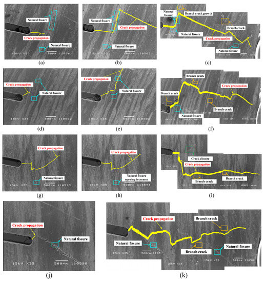 Crack propagation path under different loads. (a) XZY-1 (63.8 N); (b) XZY-1 (73.4 N); (c) XZY-1 (fractured); (d) XZY-2 (59.8 N); (e) XZY-2 (78.1 N); (f) XZY-2 (fractured); (g) XZY-3 (53.6 N); (h) XZY-3 (67.7 N); (i) XZY-3 (fractured); (j) XZY-4 (53.5 N); (k) XZY-4 (fractured).