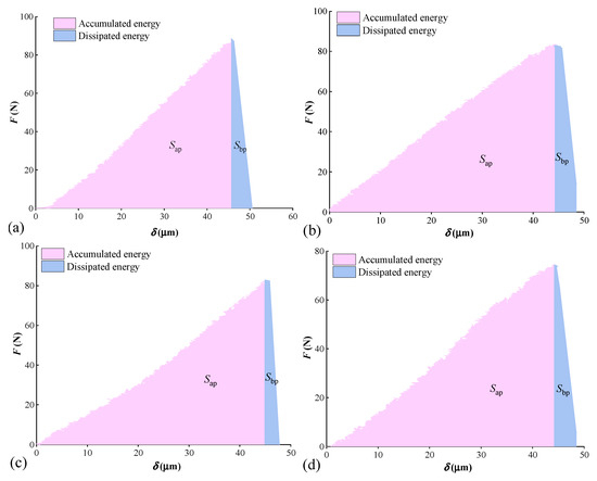 Three-point bending fracture process is a process of energy accumulation and dissipation. When the load increases from zero to maximum, the work carried out by load is considered as an accumulated energy, which is manifested as the expansion of micro cracks. The accumulated energy is equal to the area (Sbp) surrounded by the load and displacement of the pre-peak stage, as shown in Figure 9. After the load reaches the peak, the accumulated energy begins to dissipate, which is represented by a failure of coal samples. The dissipated energy is equal to the area (Sap) enclosed by load and displacement of the post-peak stage, as shown in Figure 9. The ratio of the dissipated energy (Sap) to the accumulated energy (Sbp) is expressed by the energy accumulation dissipation index α, that is [33]:
